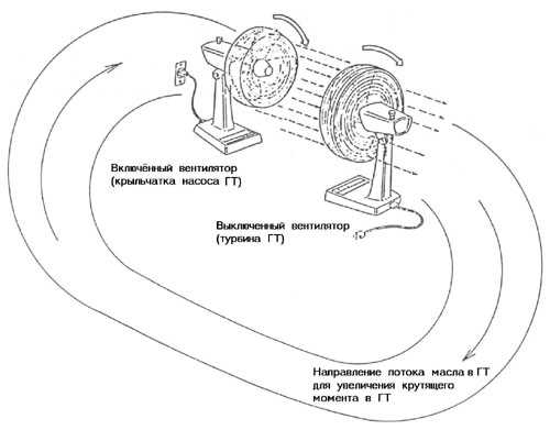 nāšanos. Līdz ar to samazinās pretdarbība darba šķidruma cirkulācijas kustībai pa apli hidrotrasformatora iekšienē. Rezultātā cirkulācijas ātrums pieaug, kas automātiski palielina griezes momentu uz turbīnrata vārpstas, (analoga situācija pārejot uz zemāku pārnesumu mehāniskajai pārnesumkārbai) tik ilgi kamēr nebūs līdzsvars starp to un kustības pretestības momentu.