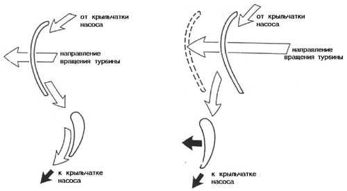 Kreisais zīmējums – reaktors HT strādā kā brīvgaitas sajūgs; labais zīmējums – reaktors HT brīvi griežas. Turbīna vienmēr griežas lēnāk nekā sūknis. Šī turbīnas un sūkņa griešanās attiecība ir maksimāla, kad auto stāv un sāk samazināties, kas tas palielina ātrumu. Tā kā reaktors saistīts ar HT caur brīvgaitas sajūgu, kas var griezties tikai uz vienu pusi, tad pateicoties reaktora lāpstiņu īpašai formai un turbīnai, eļļas plūsma virzās uz reaktora lāpstiņu apakšējo malu (zīm. 4), pateicoties tam reaktors ieķīlējas un paliek nekustīgs, pārvadot uz sūkņa maksimāl