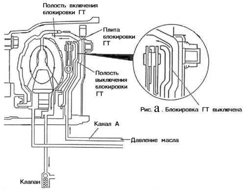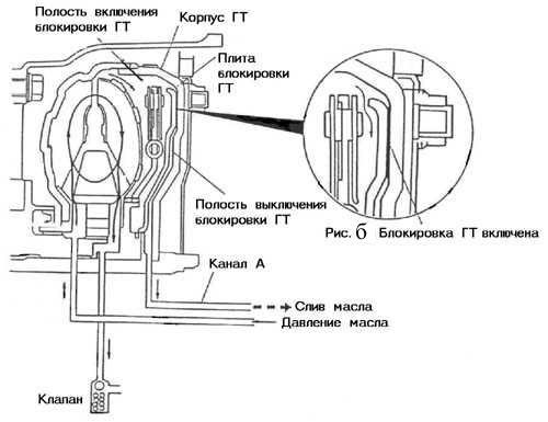 Auto sasniedzot lielu ātrumu, pēc īpašas komandas no pārnesumkārbas vadības bloka, eļļas plūsma izmainās tā, ka spiež virzuli pa labi klāt HT korpusam (zīm. B). Lai palielinātu saķeri uz korpusa iekšējās puses tik pielīmēta frikcijas uzlika. Ar virzuļa palīdzību tiek mehāniski bloķēta turbīna ar sūkni. HT pārstāj pildīt savu funkciju. Dzinējs ir cieši saistīts ar pārnesumkārbas ieejošo vārpstu. Protams, pat pie nelielas auto bremzēšanas bloķēšana nekavējoties atslēdzas.