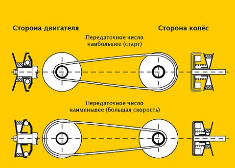 Осталось только снабдить оба шкива системой (как правило, это гидравлика, но может быть и какой-то иной сервопривод), которая будет строго синхронно сдвигать половинки первого шкива и раздвигать половинки второго. И если один шкив находится на ведущем валу (который идёт от двигателя), а второй — на ведомом (который ведёт к колёсам), то можно организовать изменение передаточного отношения в весьма широких пределах.