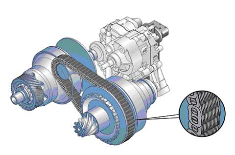А ещё в качестве клинового ремня может выступать широкая пластинчатая стальная цепь, соприкасающаяся с конусами своими краями. Именно такой «ремень» работает в вариаторах машин Audi.